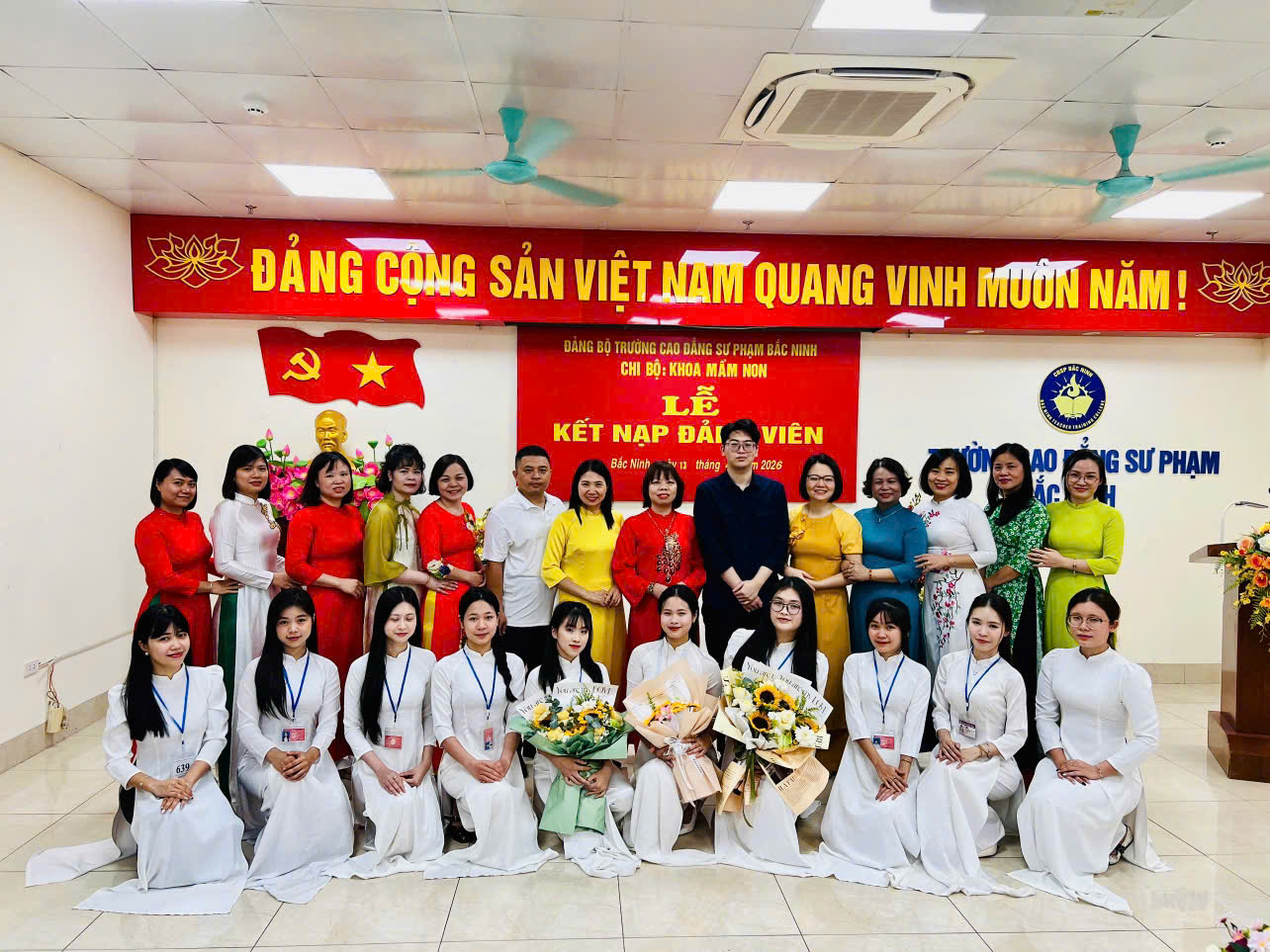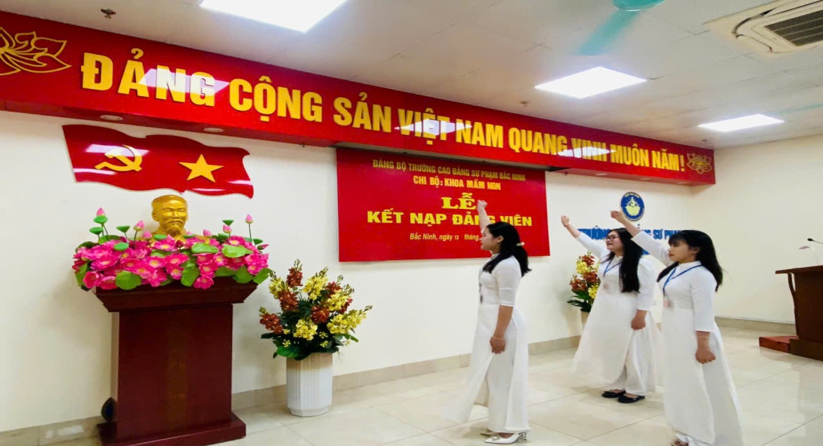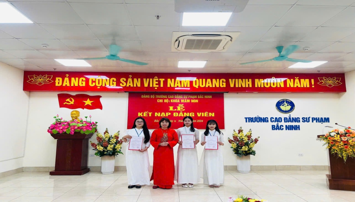 Căn cứ Điều lệ Đảng Cộng sản Việt Nam; thực hiện Nghị quyết của Đảng ủy Trường CĐSP Bắc Ninh về công tác phát triển đảng viên và Quyết định kết nạp đảng viên của Đảng ủy cấp trên, ngày 13/4/2026, tại phòng 704H, Chi bộ Khoa Mầm non đã trang trọng tổ chức Lễ kết nạp đảng viên mới cho 03 quần chúng là các sinh viên ưu tú. Đây là dấu mốc quan trọng, ghi nhận quá trình phấn đấu, rèn luyện và trưởng thành của các em sinh viên, gồm: