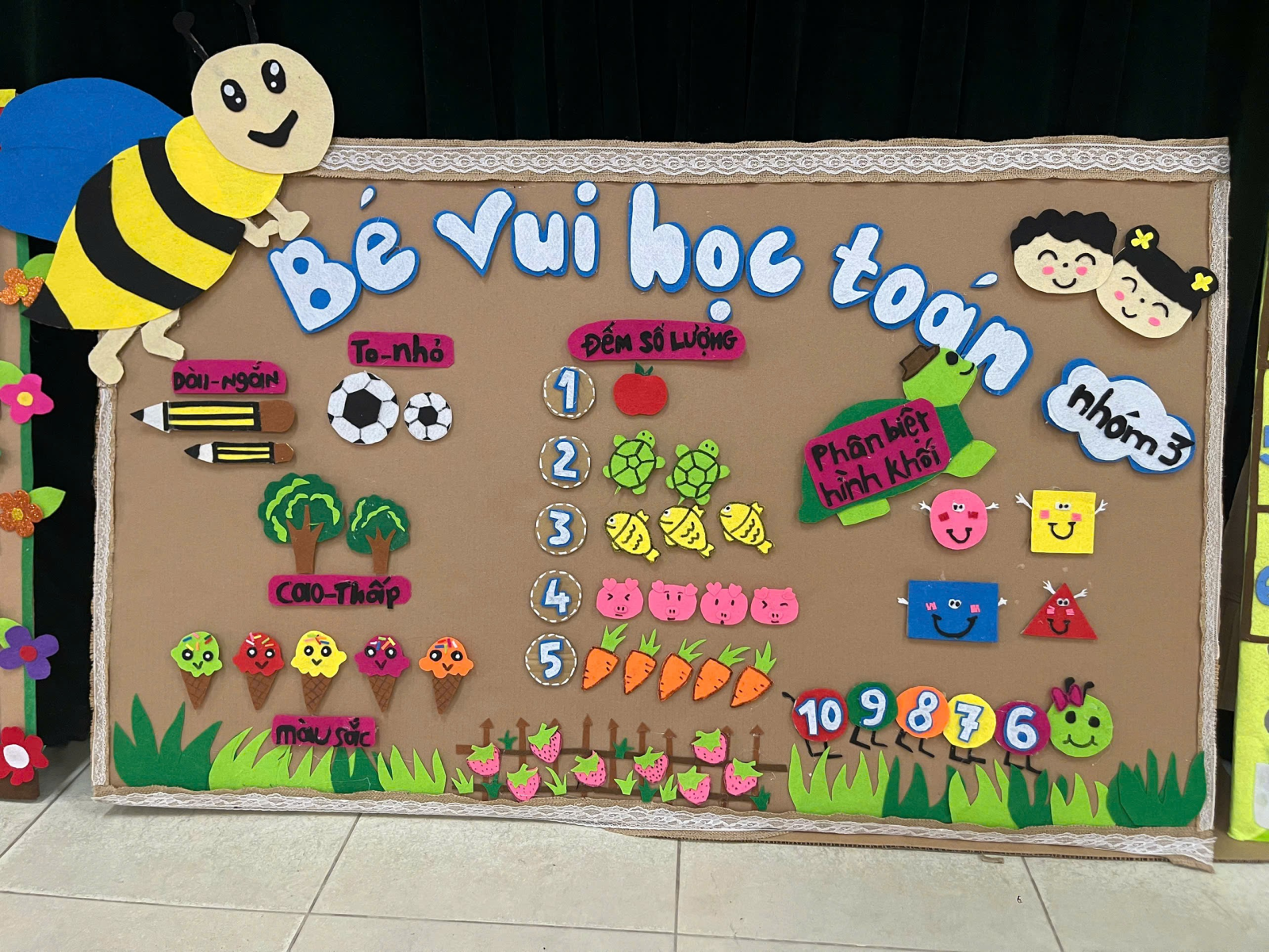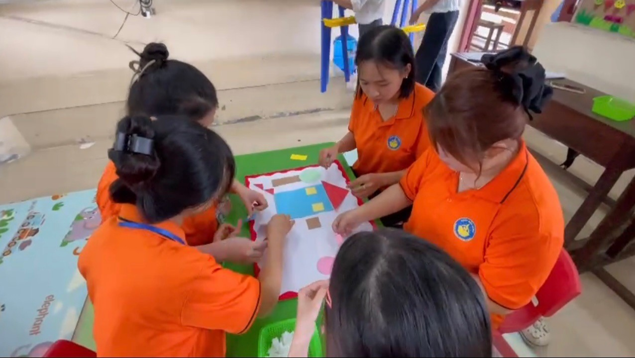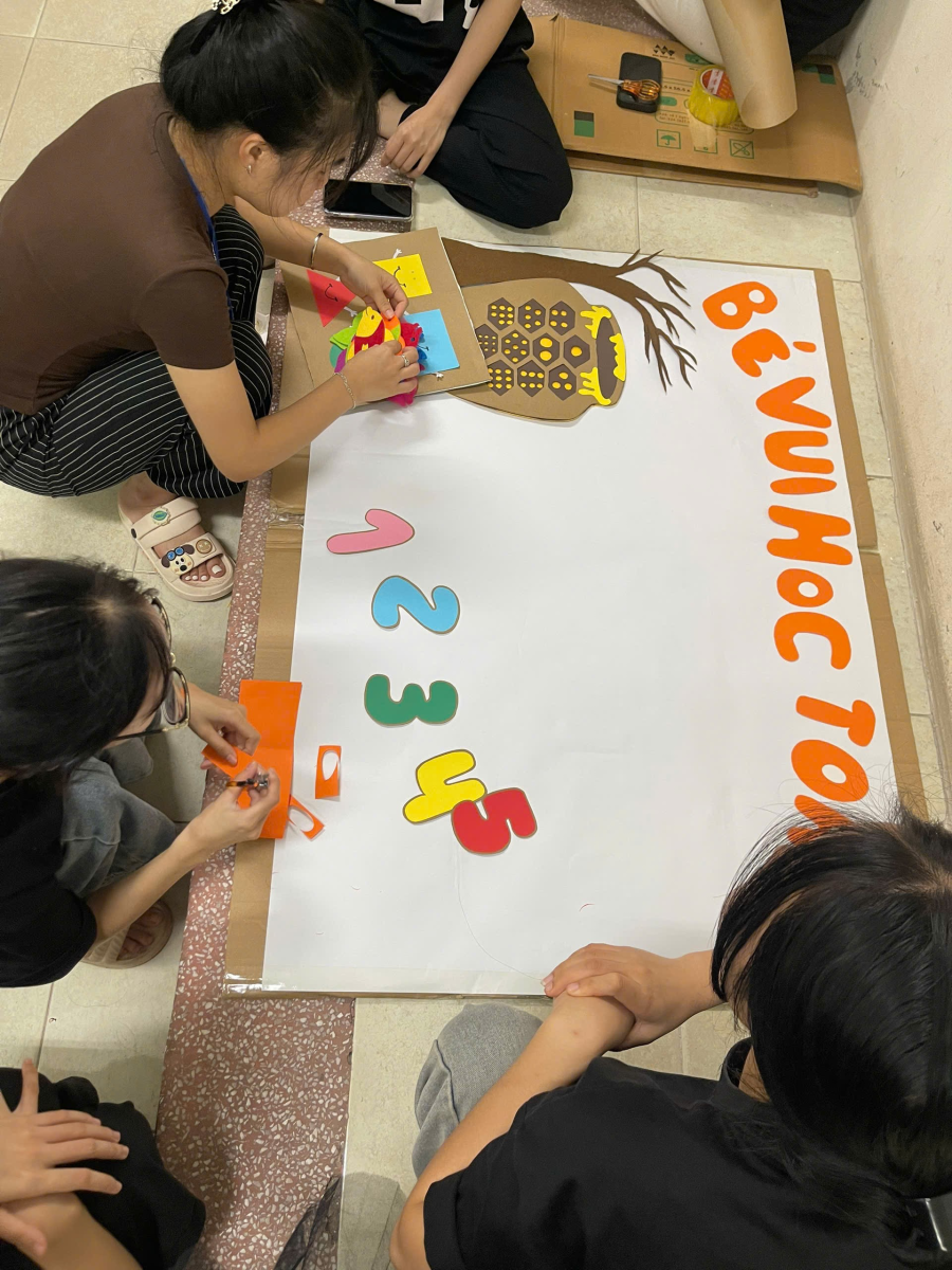 + Sinh viên được chia nhóm nhỏ (3–5 người) và nhận chủ đề toán học cụ thể như: nhận biết số lượng, hình dạng, kích thước, định hướng không gian, đo lường…