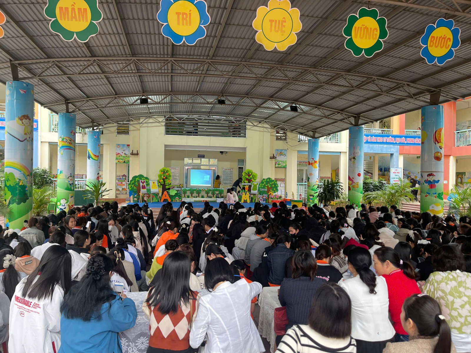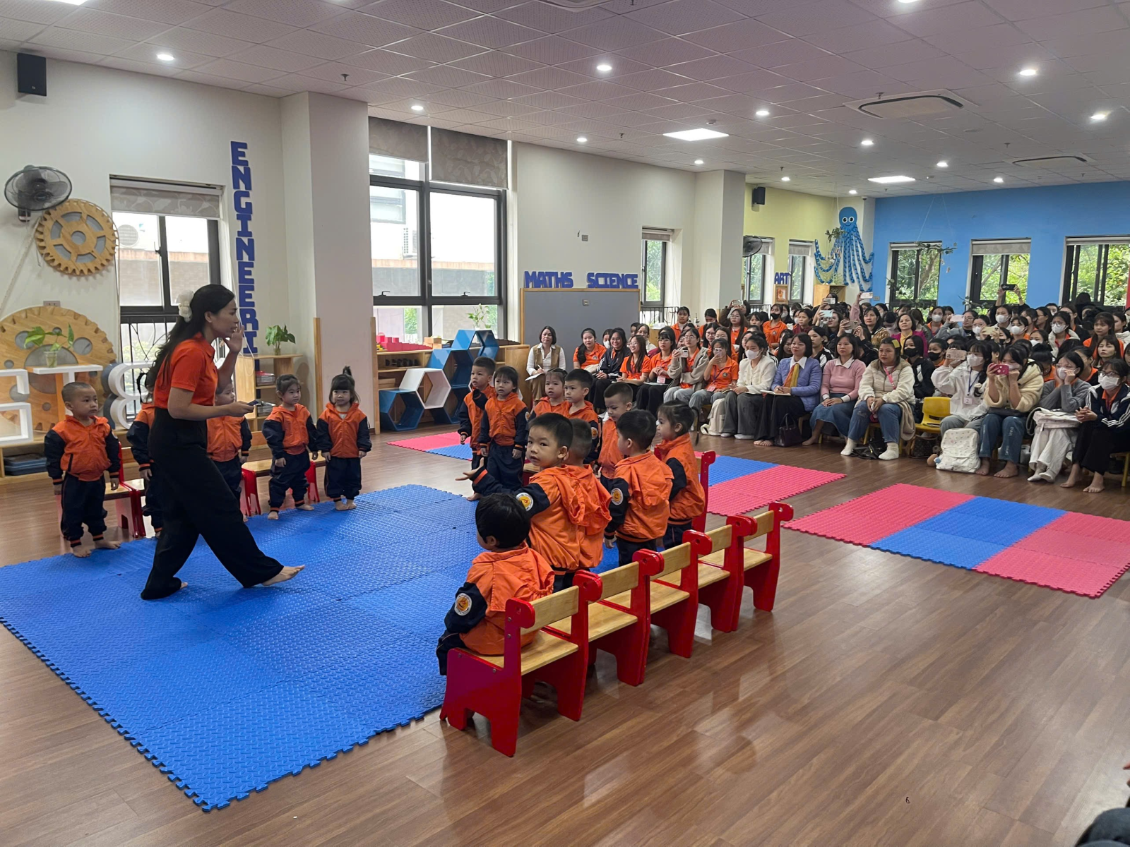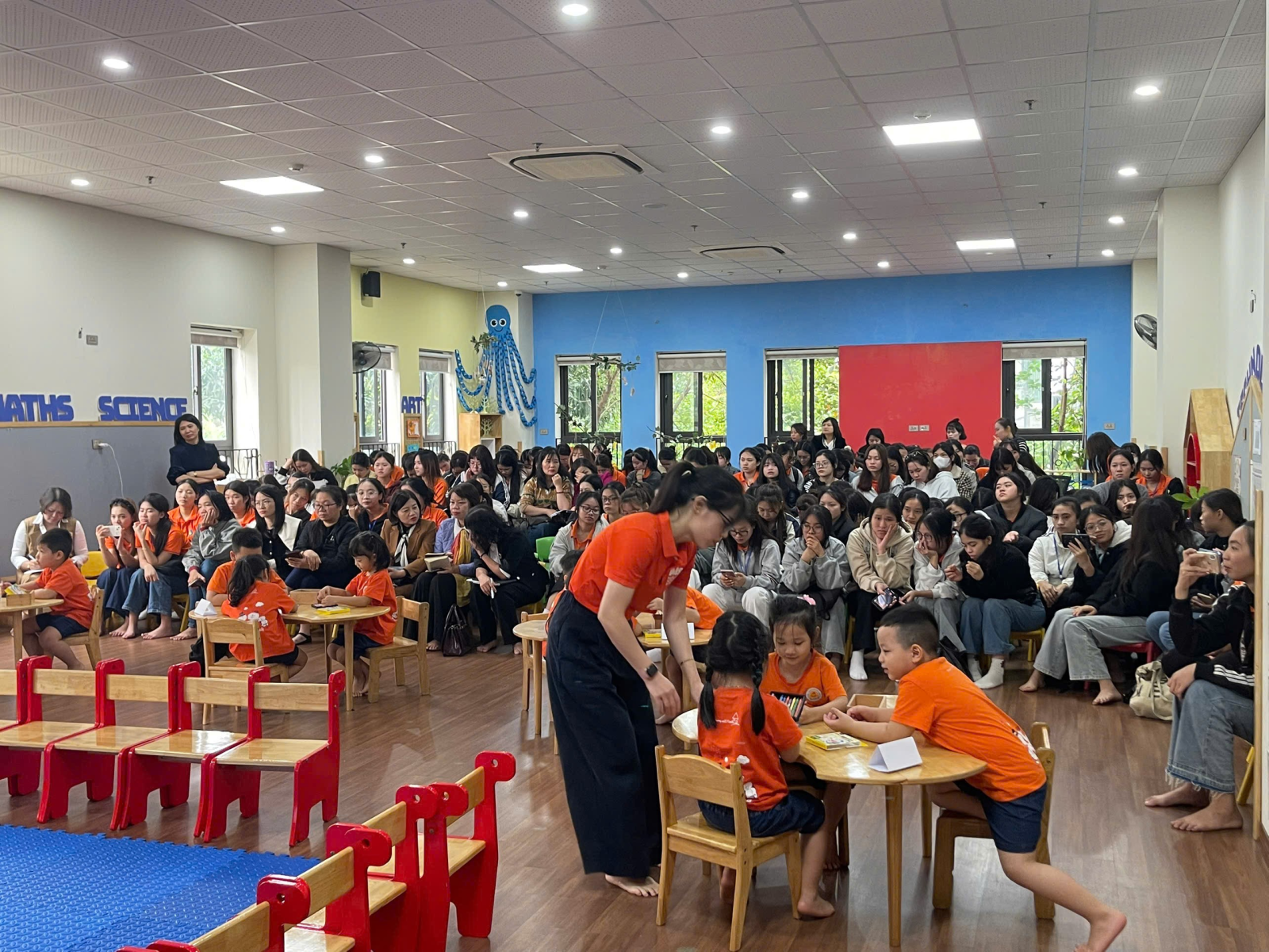 + Bố trí không gian lớp học mô phỏng: Sắp xếp bàn ghế, góc học toán, khu vực chơi… như lớp mầm non thực tế.