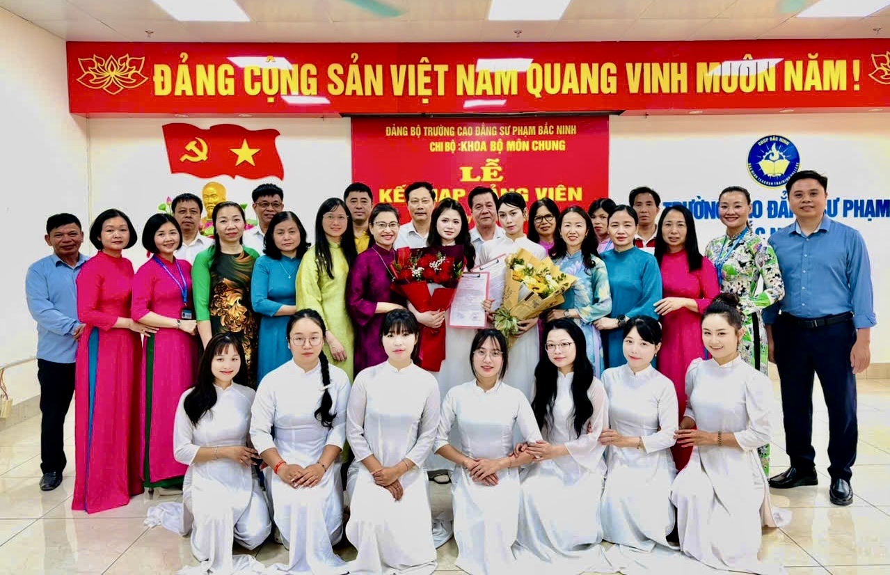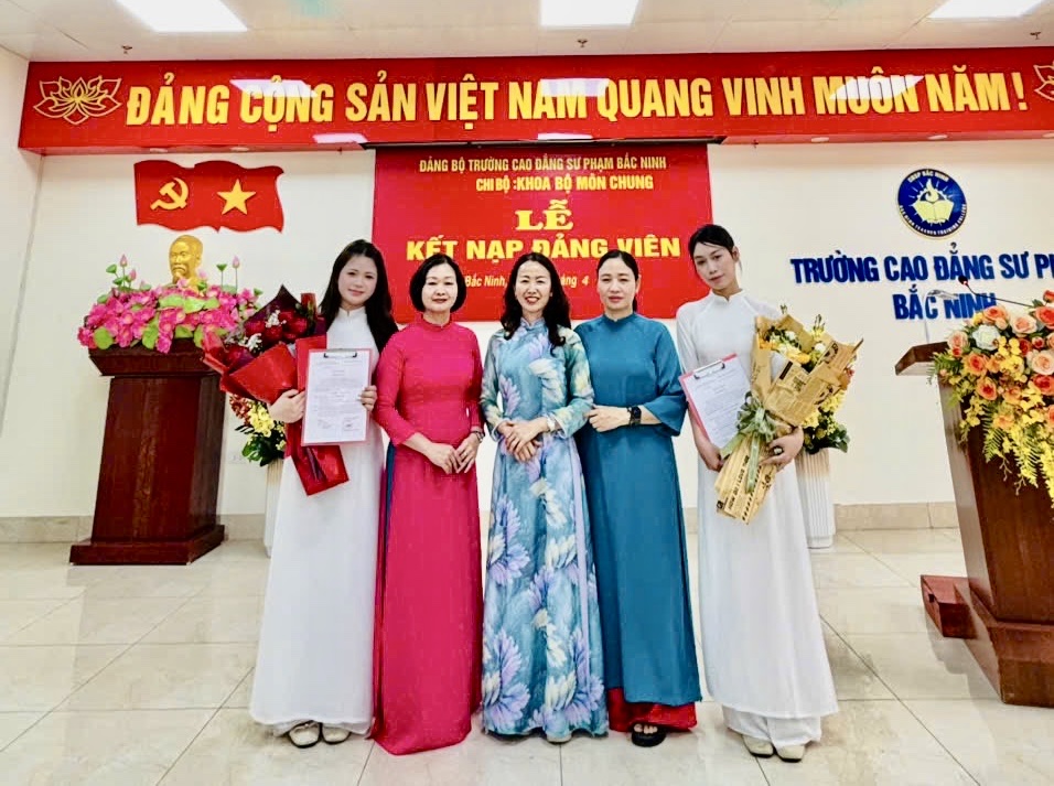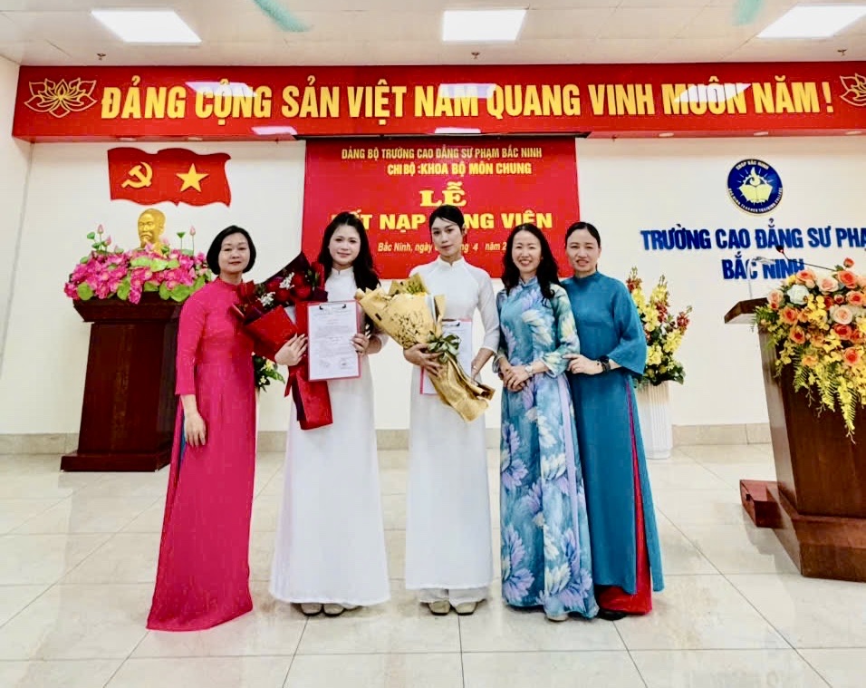Thực hiện Nghị quyết Đại hội Đảng bộ Trường Cao đẳng Sư phạm (CĐSP) Bắc Ninh nhiệm kỳ 2025 - 2030 và Chương trình công tác năm 2025, năm 2026 về công tác phát triển đảng viên; căn cứ Quyết định của Ban Thường vụ Đảng ủy UBND tỉnh về việc kết nạp đảng viên, được sự chỉ đạo của Đảng uỷ Sở Giáo dục và Đào tạo và Đảng ủy Trường CĐSP Bắc Ninh, ngày 06/4/2026 chi bộ Khoa Bộ môn chung đã trang trọng tổ chức Lễ kết nạp đảng viên mới cho 02 sinh viên Nguyễn Thị Ngọc Anh và Nguyễn Thị Minh Nguyệt - CĐMN 43H theo đúng quy định hướng dẫn thi hành Điều lệ Đảng.