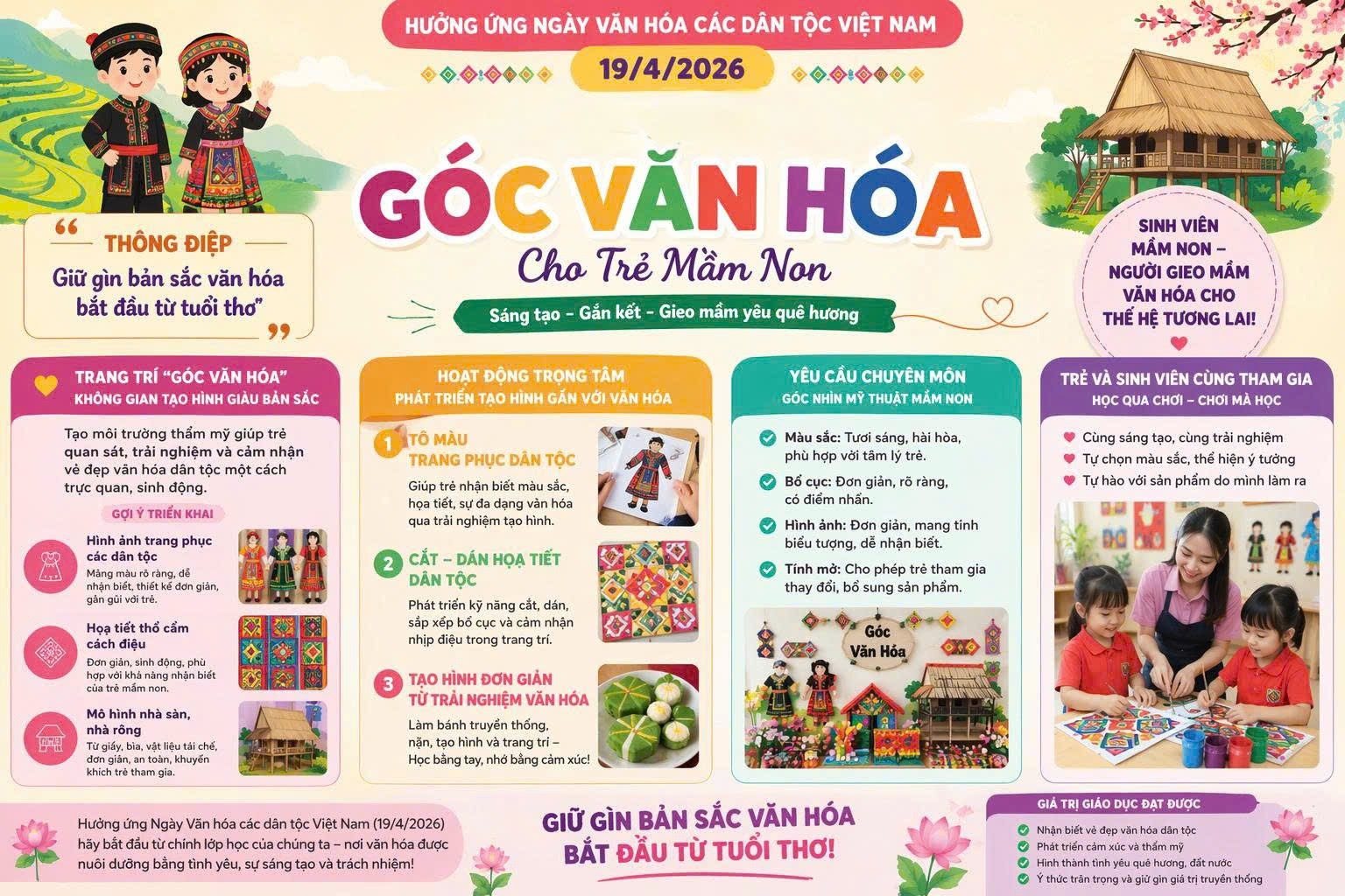 Việc tổ chức “Góc văn hóa” thông qua hoạt động tạo hình vô cùng quan trọng đối với trẻ mầm non. Từ những nét vẽ, mảng màu và sản phẩm đơn giản, trẻ sẽ từng bước cảm nhận được vẻ đẹp của văn hóa dân tộc, từ đó hình thành tình yêu quê hương một cách tự nhiên và bền vững.
