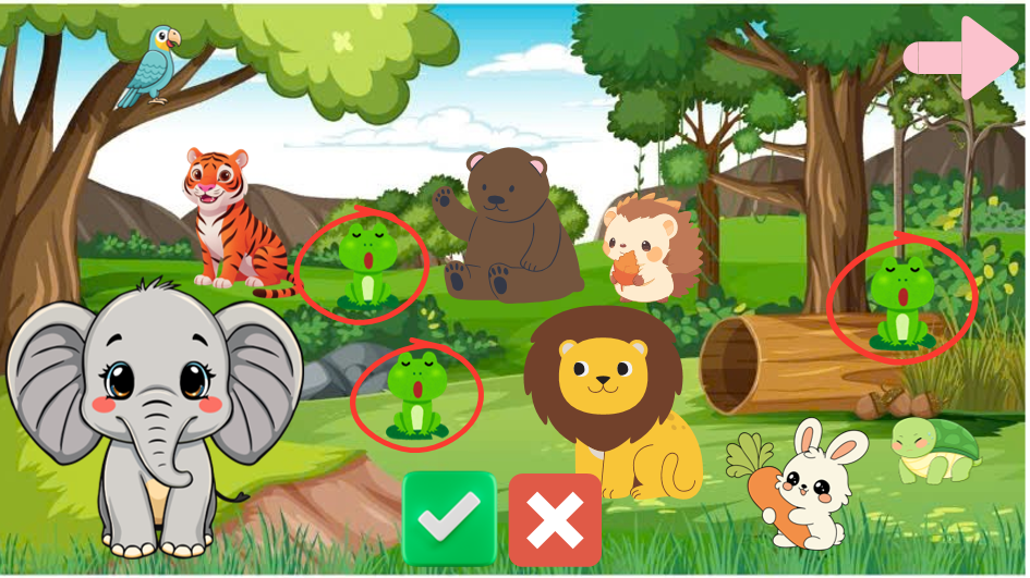 - Cách chơi: Trẻ nhấn vào từ “start”, màn hình sẽ hiện ra các con vật để trẻ quan sát sau đó trẻ sẽ nhấn chuột vào con vật đó. Nếu trẻ chọn đúng thì tích xanh sẽ hiện lên còn nếu trẻ chọn sai dấu X đỏ sẽ hiện lên.