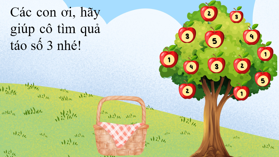 - Cách chơi: Trẻ tìm các quả táo có số theo yêu cầu của cô. Trẻ nhấn chuột vào quả táo đúng yêu cầu của cô thì quả táo sẽ tự rơi vào giỏ, còn nếu trẻ chọn quả táo không đúng yêu cầu của cô thì quả táo sẽ quay một vòng và vẫn đứng ở trên cây.